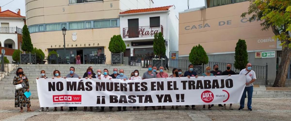 Hoy martes 7 de septiembre, a las 11 horas, en la Plaza de la Villa de Cobeña se ha celebrado una concentración convocada por la Comarca Norte de Madrid de CCOO y UGT, en protesta contra los accidentes laborales y para mostrar su dolor y su solidaridad con los familiares del joven fallecido la semana pasada, en un accidente laboral en esta localidad, al quedar atrapado en una máquina troqueladora. Al final de este acto se ha leído un manifiesto conjunto de los dos sindicatos y se ha guardado un minuto de silencio.